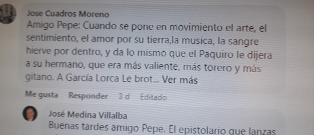 En estos años de amistad -entre otras cosas-, he podido apreciar su arte, su talento y sus ganas de aprender y conocer la esencia del flamenco; ese Cante Jondo, del que refiere: "es como una herida punzante, que abre tu pecho para que salga todo un halo de sentimientos", que lo lleva en sus venas y del que antes o después saca a relucir, en forma de comentarios o, simplemente de entonar cualquiera de sus numerosos "palos" de los que él, hace gala conocer.
